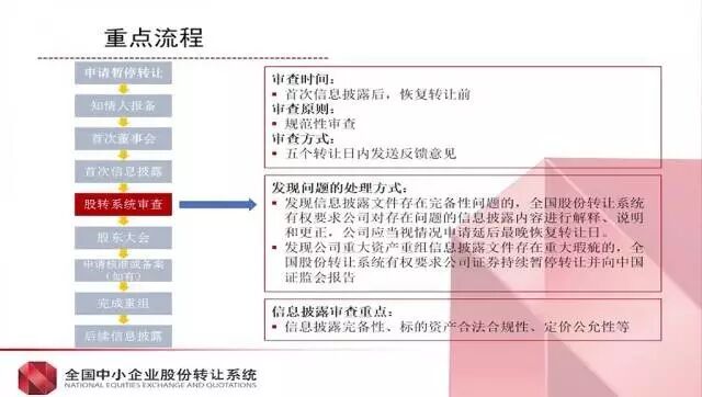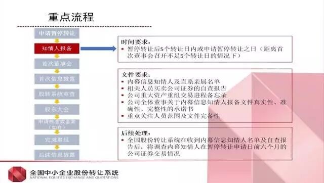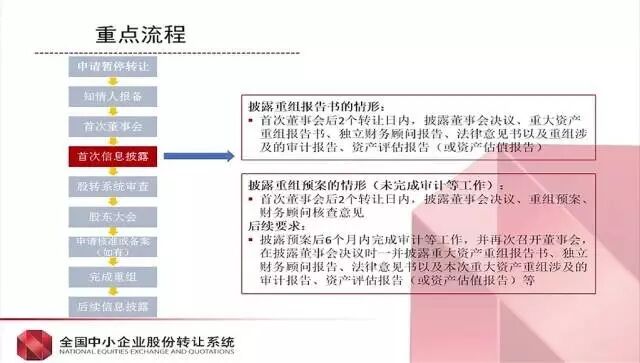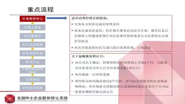 申请暂停转让——知情人报备——首次董事会——首次信息披露——股转系统审查——股东大会——申请核准或备案(如有)——完成重组——后续信息披露